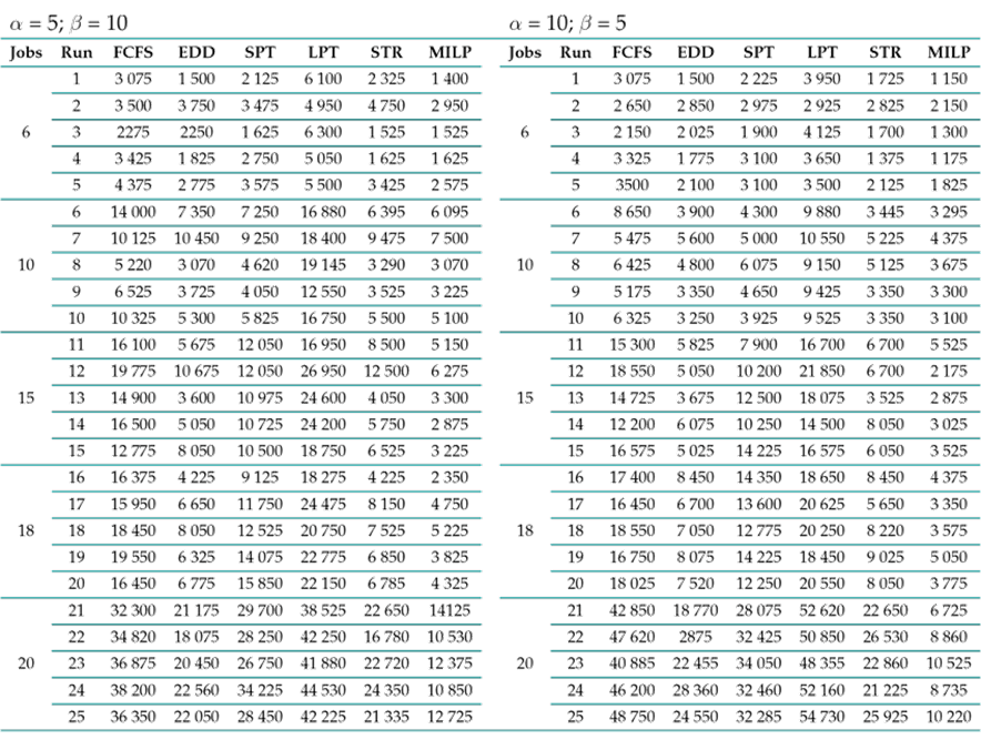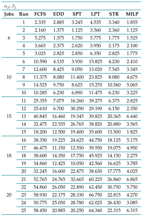 Stage one. Constant penalty values were assumed to analyze the system’s performance when the penalty for tardiness is greater than that for earliness and vice versa. The penalty values used were α =5andβ =10.Inthesecond instance, the penalty values used were α = 10 and β = 5.
