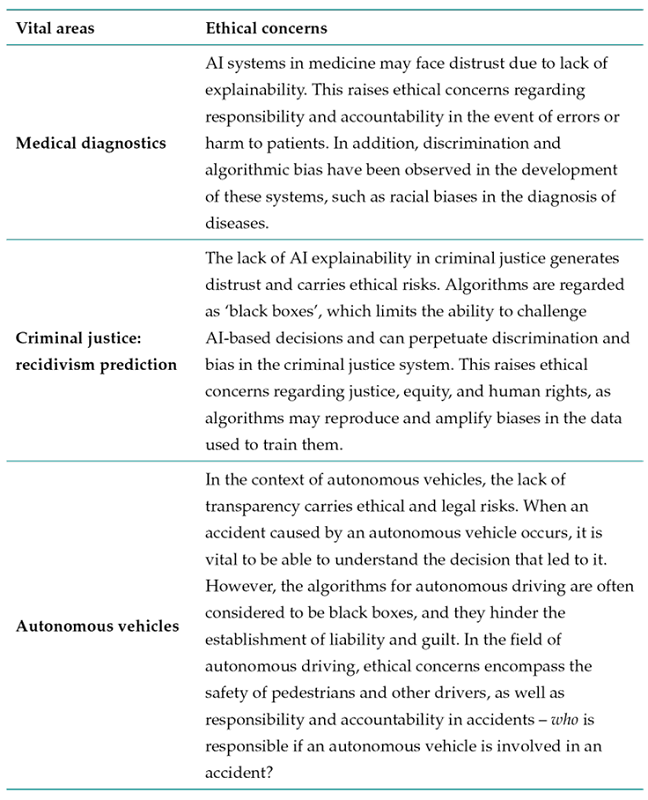 Context: The advancement of artificial intelligence (AI) has brought numerous benefits in various fields. However, it also poses ethical challenges that must be addressed. One of these is the lack of explainability in AI systems, it i.e., the inability to understand how AI makes decisions or generates results. This raises questions about the transparency and accountability of these technologies. This lack of explainability hinders the understanding of how AI systems reach conclusions, which can lead to user distrust and affect the adoption of such technologies in critical sectors it e.g., medicine or justice). In addition, there are ethical dilemas regarding responsibility and bias in AI algorithms.