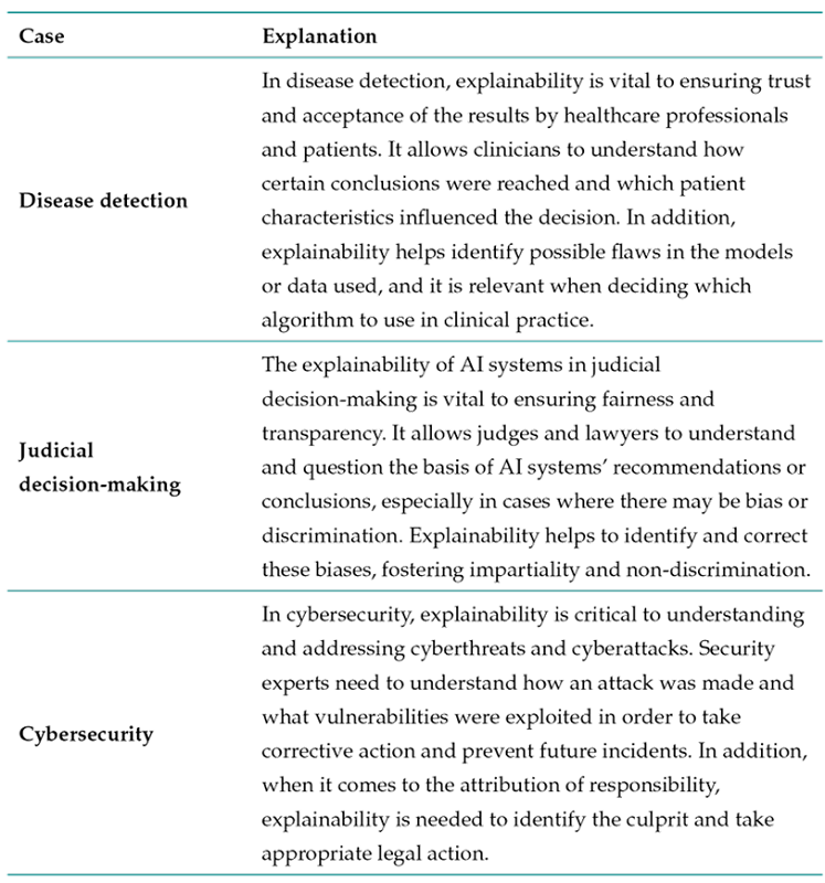 Moreover, explainable AI systems also promote ethical accountability. When they can understand and reflect upon the decisions made by AI tools, people can identify errors, biases, or unintended consequences 10. This facilitates the identification of potential ethical risks and the adoption of measures to mitigate them. Explainability is vital in several cases 22, as presented in Table II.