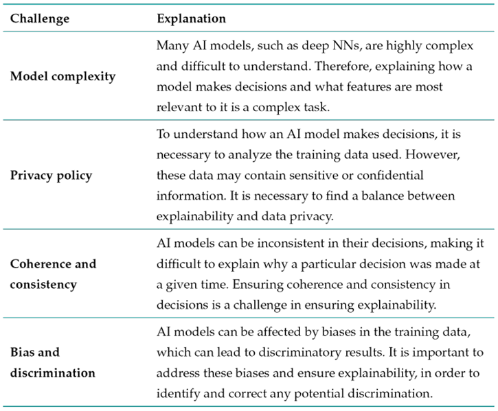 There are several challenges associated with AI explainability. Some of them are shown in Table III8,23.