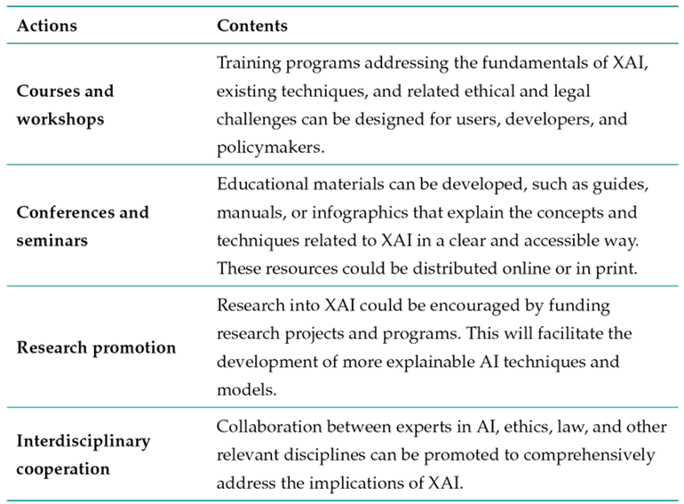 Finally, policymakers have a critical role in promoting AI explainability. They must understand its importance and legislate accordingly 27. This implies establishing regulatory frameworks that require the explainability of AI systems in certain contexts, such as automated decision-making in the legal or healthcare fields. They should also encourage research and training and promote collaboration between the public and private sectors, in order to guarantee the responsible development of AI. To implement training and outreach programs on XAI, different actions can be undertaken (Table IV).