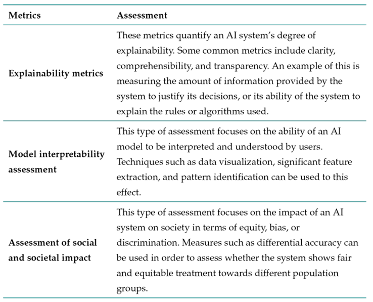 Ethical metrics and assessments to measure AI explainability are critical to ensuring transparency and reliability. Some proposals reported in the literature are presented below 18,31,32 (Table V).