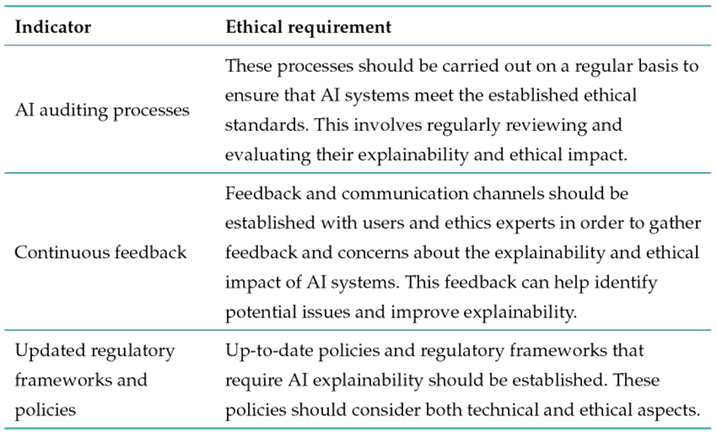 The importance of the elements in Table VI lies in their contribution to ensuring that AI systems are ethical and meet the established standards. For example, periodic AI auditing processes are essential for regularly evaluating the explainability and ethical impact of AI systems. This enables the identification of potential ethical issues and the timely implementation of corrective actions. Furthermore, this constant review helps to improve the understanding of how a system works, which in turn allows explaining its decisions and actions to users and ethics experts.
