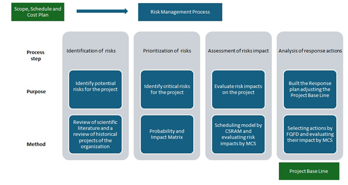 This selection process is conducted during the planning phase, after designing a preliminary baseline of scope, time, and costs 7. Risk management is the process involved in this type of decision-making, and its phases include identification, prioritization, evaluation, response design, implementation, and control 7,10,11.