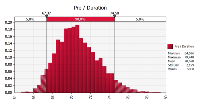 First, the deterministic model was defined, and information from the influence analysis was collected. The next step was to calculate the duration coefficient of each task, in order to model the duration of the tasks that served as input in the simulation. The output of the model was the duration of the project. With the @Risk add-in of Microsoft Excel, the model was elaborated, and several tests were carried out to evaluate the convergence of the results. The simulation was carried out with 2000, 5000, and 10 000 iterations. In the first case, the average duration was 70.68 days, with a standard deviation of 2.2 days. In the second case, this value was 70.68 days, also with standard deviation of 2.2 days. In the third case, the average duration was 70.62 days, with the same standard deviation. With the little variation obtained, we decided to use the model with 5000 iterations for the project. The results are shown in Fig. 2.