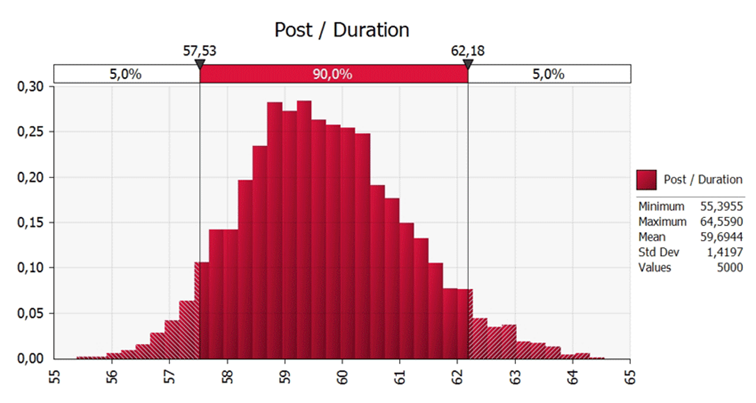 The last step was to carry out a post-action simulation of the project. Considering the responses to the prioritized risks, the new conditions were included in the model. For the non-prioritized, remaining, and secondary risks, the group decided to apply a contingency reserve from the MCS, and, for the unknown risks, the group used a management reserve defined by the company (1%). The simulation was carried out with 5000 iterations, resulting in a duration between 55 and 64 days, with an average of 60 daysFig 3..