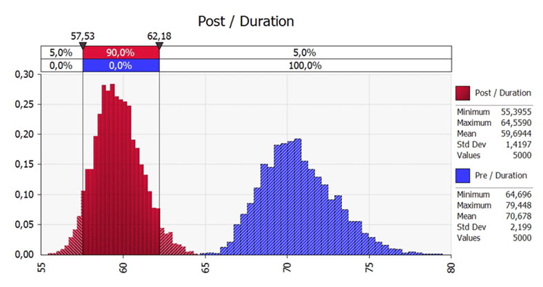 Compared to the pre-action simulation, the 63-day project had a 96% probability of completion. In graphical terms, the frequency curve shifted to the left, as indicated in Fig. 4 where the initial simulation is seen in red and the post-action one is seen in blue.