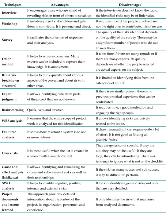 Identification of potential risks. The first step in the methodology is to identify the risks that may positively and negatively affect the project. There are different risk categories within the scope of a project, e.g., operational, economic, social, political, financial, regulatory, nature-related, environmental or technological. Operational risks, for instance, are those related to the actual operation of the project. The product of this phase is a list with many potential risks. Table I presents the various methods for identifying potential risks.