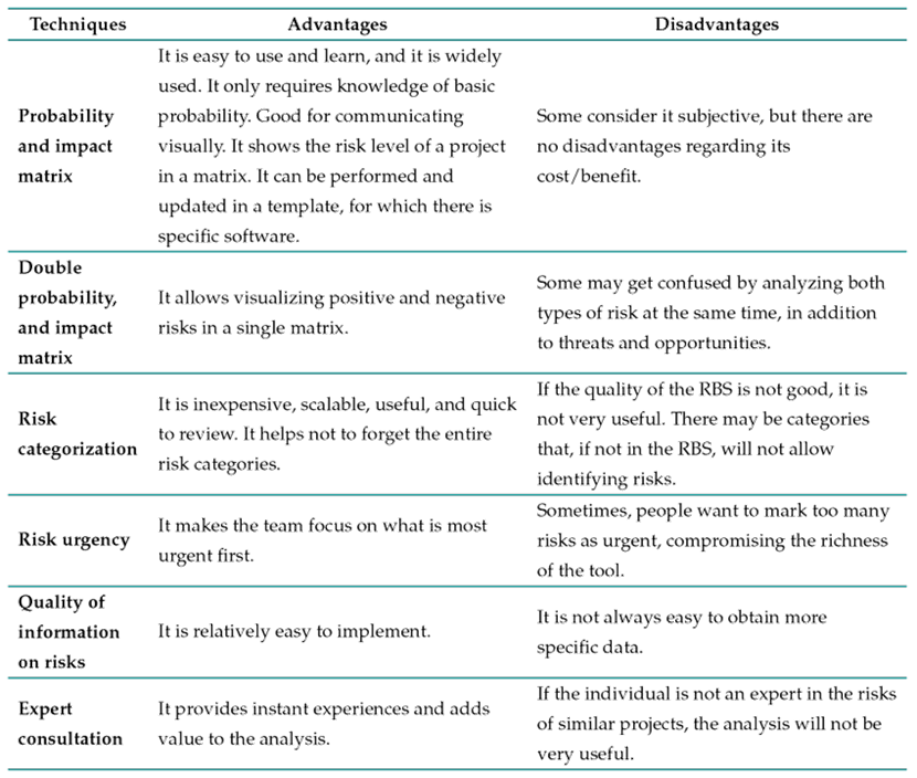 Qualitative analysis. After obtaining the list of potential risks, the methodology determines their priority level to identify critical risks for the project. Some qualitative analysis methods are shown in Table II.