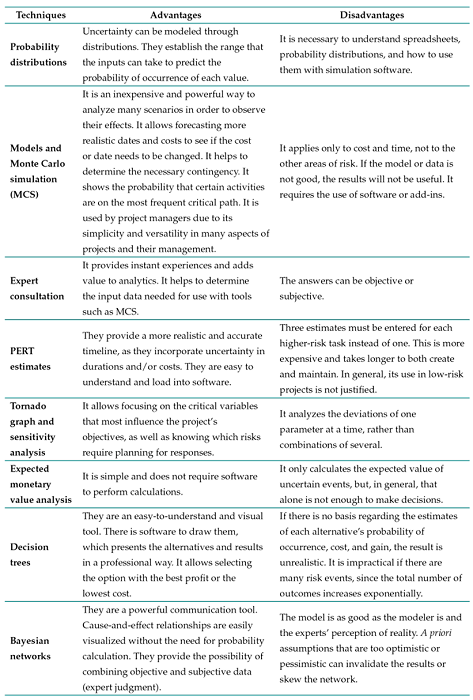 Quantitative analysis. Once the critical risks have been identified, a numerical evaluation of the impact on project objectives is conducted. This effect is usually oriented to the project’s time or cost objectives 7,19. Some quantitative analysis methods are shown in Table III.