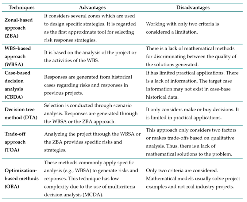 Response planning. After evaluating the project’s risk level, response plans must be developed while considering several corrective actions, thereby minimizing the threats to the project objectives and maximizing the opportunities it can offer 7. Those actions are usually classified into four general categories: acceptance, transference, avoidance, and reduction. A decision-making process has to be conducted to evaluate and select the appropriate action. Some response planning methods are shown in Table IV.