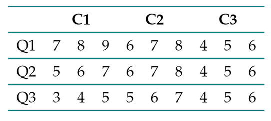 where Correlation = {rij | i = 1,...,q; j = 1,...,c}; c represents the total number of hows; and rij is the triangular number (rija,rijb,rijc) consolidated between each qi and each cj.