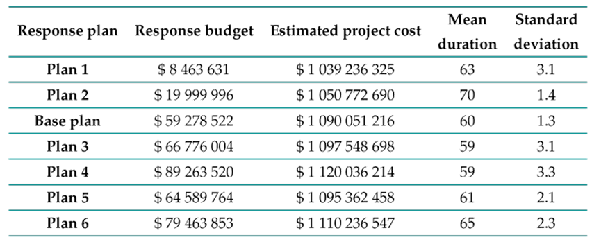 Two additional plans proposed by the organization’s engineering team were tested. Plan 5 resulted in an expected duration of 61 days, within the maximum time allowed. Considering the resulting deviation of this simulation, this plan had an 83% probability of completion before 63 days for $64 589 764. This plan was in the middle of the previous plans, which sought to minimize cost and time. However, it was more expensive than the base plan and had a lower probability of success.