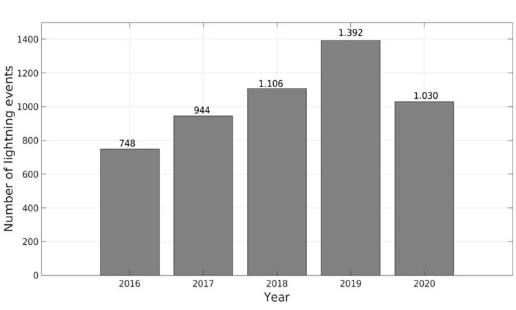 Fig. 2 illustrates the total number of lightning strokes recorded in Fusagasugá from January 1, 2016, to December 31, 2020. Over these 1827 days, 5220 strokes were recorded within the municipality’s territory. The graph depicts an apparent annual increase in lightning events, with a 26 % increase from 2016 to 2017, a 17 % increase from 2017 to 2018, and a 25 % surge from 2018 to 2019. However, this upward trend is interrupted by a 26 % reduction from 2019 to 2020.