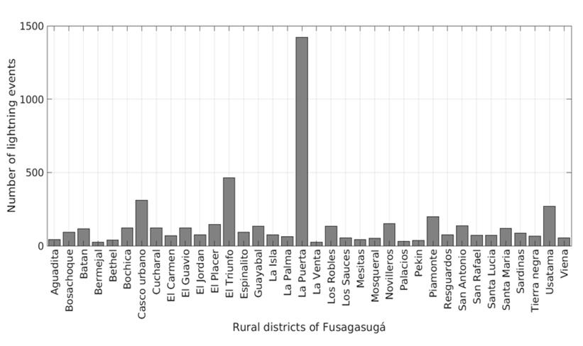 For example, the average number of lightning events for the entire territory of Fusagasugá is low when compared to the departmental and national averages. However, when analyzing occurrences in rural districts, it becomes clear that a municipality’s small area experiences high lightning activity. Relying solely on municipal average activity would overlook the local population and infrastructure, as they would not be considered at high risk of lightning impact. The results of this research highlight the importance of lightning climatology studies on smaller scales.