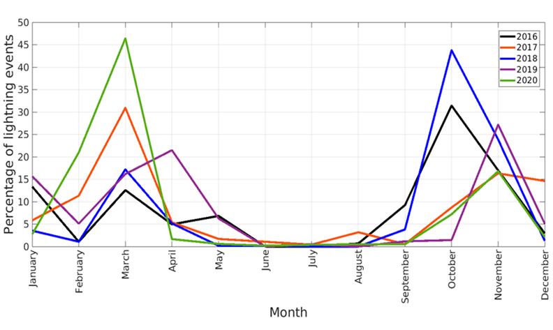 The year 2020 exhibited a lower annual lightning activity but reported peak activity in the first half of the year, much higher than that observed in the previous four years (Fig. 2). Although this study does not examine the relationship between lightning activity and other meteorological phenomena, the decrease in activity observed in 2020 may be related to the weakening of the final phase of the La Niña phenomenon experienced between 2020 and 2021 16.
