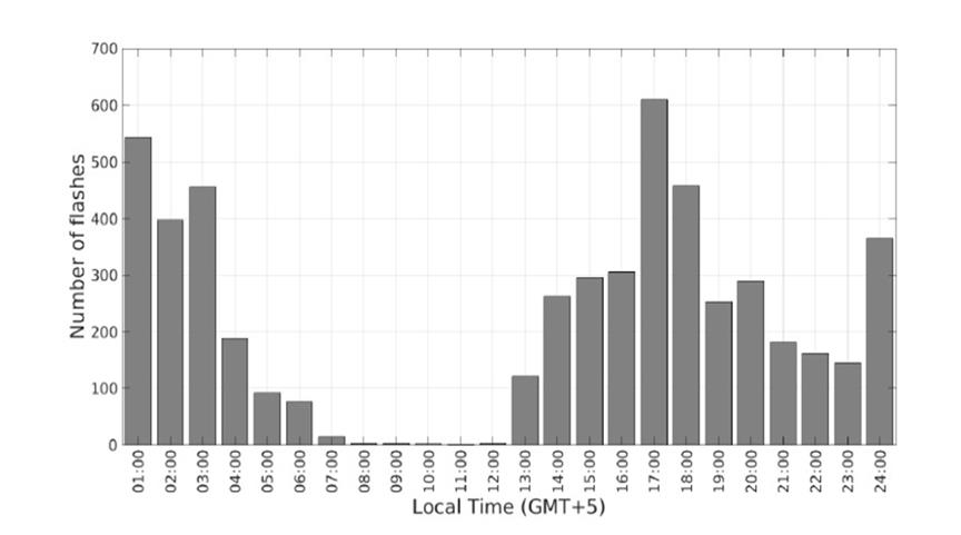 To determine the timing of lightning occurrences in Fusagasugá, five years of data were filtered and plotted by hour. As depicted in Fig. 5, the activity remains minimal during the morning hours and until noon. Subsequently, there is a gradual increase, with two peaks observed around 17:00 and 01:00 (local time, GMT+5).