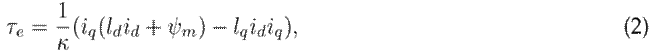 This model is represented within a dq0 reference frame aligned with the q-axis1. The state variables are the currents in the stator (id,iq ) and the rotor’s electrical rotational speed ωe . The electrical torque is given by 2: