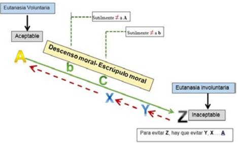 Tal descomposición social e individual no es un proceso que se da de golpe en un sentido lineal, sino que hace parte de un proceso prolongado en el que intervienen diferentes factores del lazo social hasta configurar un caldo de cultivo propicio para prácticas y discursos que trastocan los valores y principios básicos de una sociedad al ponderar la axiología social de manera distinta, como producto de interacciones bio-políticas y socio-culturales, en una especie de descenso moral que denota progresivamente la pérdida de todo tipo de escrúpulos morales con los principios tradicionales que ostenta e identifica su entorno cultural. Este proceso descendente de la conciencia moral, se ha venido denominando como la Pendiente Resbalosa (PR). Se trata de un esquema planteado con cierto éxito en los dilemas bioéticos en general, y en la eutanasia en particular. En la eutanasia, la PR hace referencia a que: