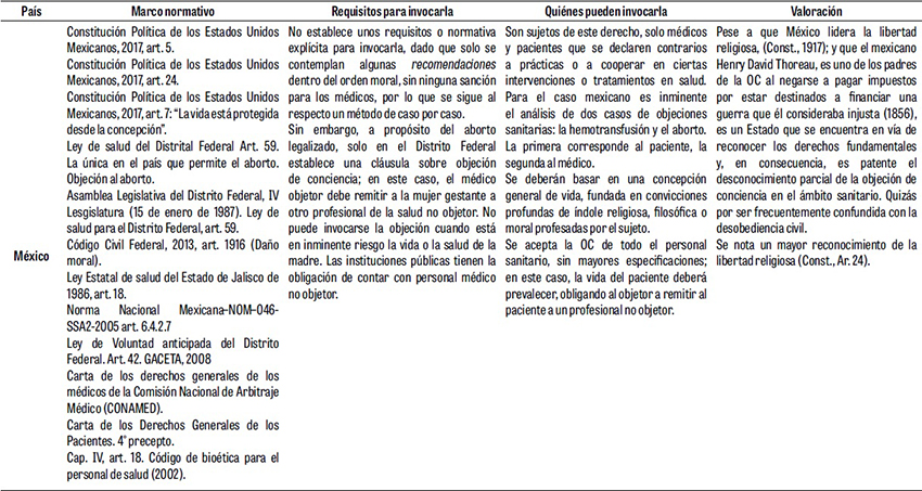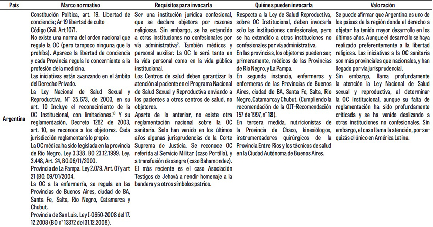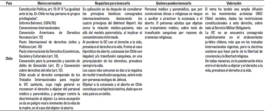 En la tabla 1 se presentan tres casos latinoamericanos (México, Argentina y Chile)8 con relación a la objeción de conciencia en el ámbito sanitario9, dado que la OC a la eutanasia en todos los países de América Latina es hipotética, ya que en ningún país de la región (excepto Colombia) existen leyes relativas a la terminación de la vida a manos del personal sanitario.