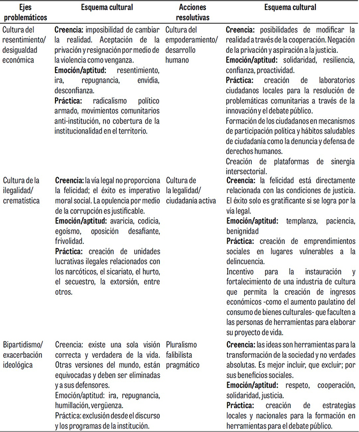 La revisión de las causas del conflicto armado en Colombia como el diagnóstico hecho por el pragmatismo de la violencia a modo de manifestación negativa de la ideología, nos permite determinar tres ejes problemáticos y, por tanto, tres conjuntos de acciones resolutivas que podrían orientar -en un ejercicio posterioruna política pública educativa para la consecución del posconflicto en Colombia. En la Tabla 1 se encuentra de forma sucinta la propuesta de este ensayo: