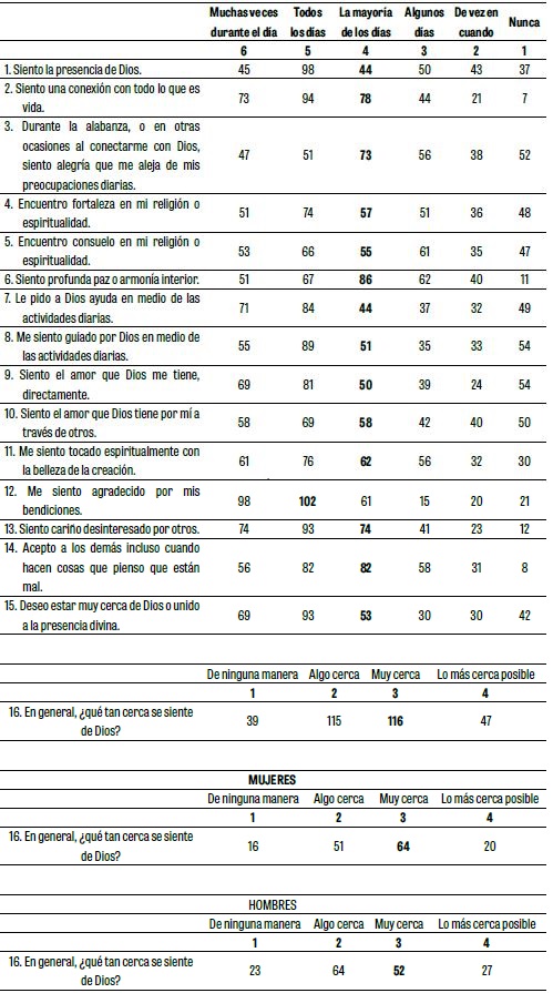 A continuación, se expone la tabla de calificación de puntajes globales de la escala para evaluar la experiencia espiritual diaria en los estudiantes universitarios de la UPB. Los números que se encuentran resaltados representan el puntaje global de cada enunciado; son el resultado que se deriva luego de promediar los diferentes valores arrojados por la escala y permiten interpretar la tendencia de la población para cada afirmación. Como se observa, el puntaje global es casi siempre: la mayoría de los días, salvo en el enunciado 12: todos los días, y en la pregunta 16: muy cerca. En definitiva, la encuesta marca una tendencia asimétrica positiva y muy homogénea en todos sus enunciados y, por consiguiente, se puede aseverar que efectivamente la población encuestada posee una experiencia espiritual en sus vidas que se manifiesta la mayoría de los días, lo cual les permite percibirse muy cerca de Dios.