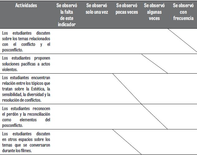Sobre el posconflicto, luego de que los estudiantes fueron partícipes de las discusiones mientras observaban los filmes, se destaca el siguiente testimonio: "Pues el arte del cine nos ha servido mucho para entender otras guerras, otros conflictos y también cómo los han solucionado, pues todos tenemos diferencias, pero sin violencia es más fácil llegar a la solución" (Estudiante entrevistado 39, comunicación personal, 9 de marzo de 2018). Lo que evidencia, en primer lugar, que si bien existe una transformación en la percepción luego de las obras de cine, desde el principio se evidencia en los estudiantes un repudio por todas las formas de violencia que han destruido el seno de la sociedad colombiana. A su vez, es preciso anotar que aún persisten rasgos identitarios de algunas ideologías dominantes, pues algunos estudiantes respondieron persistentemente cosas como: "Yo acepto el posconflicto, pero si se mueren esas ratas guerrilleras" (Estudiante entrevistado 8, comunicación personal, 9 de marzo de 2018). Esta situación obliga a un tratamiento especial para este tipo de casos, estas personas requieren un acompañamiento emocional personalizado, pues no se puede negar a los estudiantes, independientemente de sus condiciones históricas, el derecho a reflexionar sobre lo que los edifica como seres humanos. Este asunto lo confirma Velasco (2017)) en su investigación:
