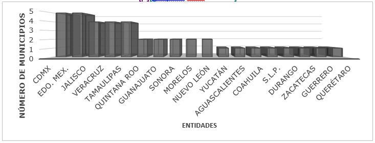 Los geoportales, entendidos de manera general como instrumentos que permiten visualizar la información de forma geográfica, interactuar con ella y tomar decisiones a partir de su uso, se presentan en 40 de los 205 municipios y delegaciones (19.5%) que cuentan con un portal gubernamental en internet. Dentro del análisis realizado en 30 estados y la Ciudad de México, se encontró que sólo en 18 de ellos se comienza a utilizar a los geoportales como herramienta de información en sus páginas de internet, donde el Estado de México, Jalisco y Tamaulipas son las entidades con más municipios innovadores en la materia (gráfico 1).