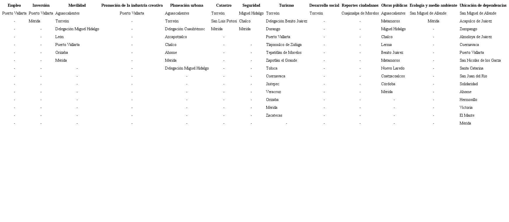 Por otra parte, también se encontró que los geoportales son usados para temas de catastro, seguridad, inversión, medio ambiente, promoción de industrias creativas, desarrollo social, reportes ciudadanos, así como para aspectos muy peculiares como la localización de depósitos de pilas en la ciudad, ubicación de lugares comerciales dónde se puede pagar el predial, georreferenciación de ciberparques e incluso información sobre la maternidad adolescente, por mencionar algunos. En este sentido, entre los geoportales con información más diversa y completa se encuentran las experiencias de los municipios de Mérida y Torreón (cuadro 1). Además, es importante señalar que la liberación de forma gratuita de la plataforma "Mis Mapas" de Google ha facilitado la construcción de geoportales en los gobiernos locales, de tal manera que 90% de los 40 municipios que cuentan con geoportales utilizaron esta infraestructura geográfica digital para mostrar su información.