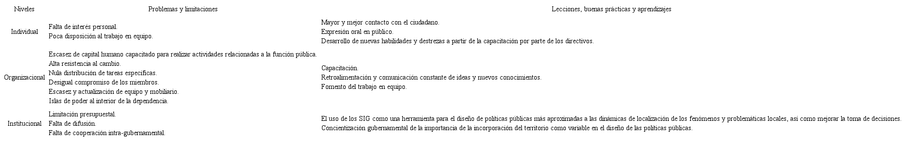 Al surgir la iniciativa de crear el geoportal, éstas y otras grandes dificultades se hicieron presentes (cuadro 4). Al respecto se encontró que, a nivel individual, el miedo o la falta de interés por involucrarse en proyectos que requieren desarrollo de nuevas habilidades y el trabajo en equipo, fueron situaciones que impactaron sobre la dinámica de trabajo.