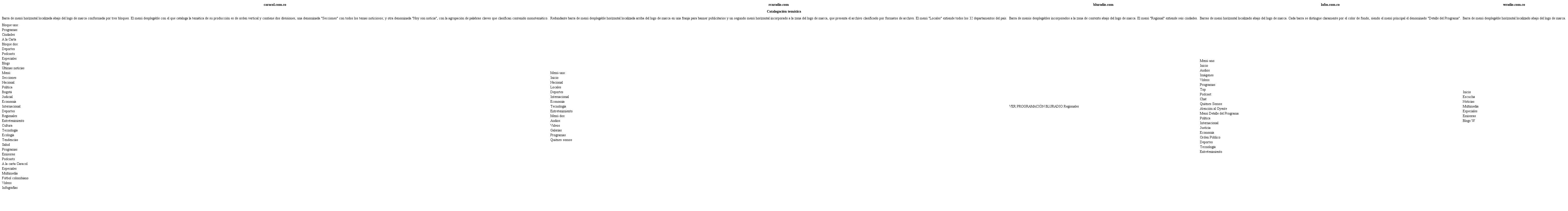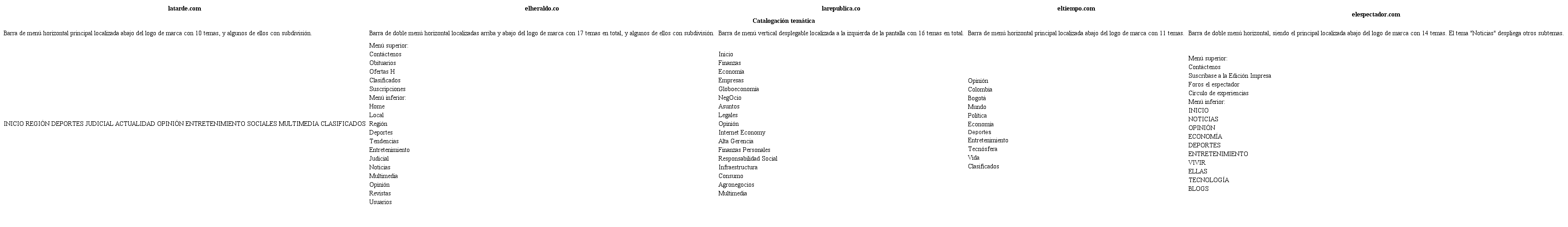 La tabla 1 muestra la catalogación de temas comparativa entre los cinco periódicos diarios elegidos. Todos los diarios nacionales digitalizados catalogan sus temas noticiosos mediante (secciones) una barra horizontal que contiene el menú principal y se encuentra localizado abajo del logo de marca. Dos de ellos, utilizan adicional una barra horizontal para un menú secundario localizado encima del logo de marca.