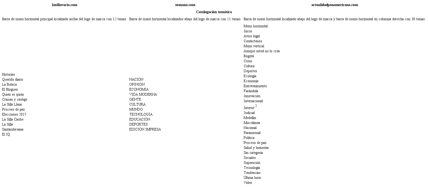 En general todos los periódicos y medios de comunicación digital analizados catalogan su temática periodísticamediante la configuración de la barra de menú horizontal, en mínimos casos desplegable, ubicada en la parte inferior del logo de marca. Las unidades de contenido (noticias), por tanto, se ordenan dentro de aquella área de interfaz de usuario mediante asuntos definidos por cada medio (secciones periodísticas), según el enfoque editorial de su negocio. Para todos estos medios son recurrentes tres temas o secciones periodísticas: "Opinión", "Deportes" y "Entretenimiento". La segunda relación temática más frecuente para todos los medios analizados es "[ avisos ] Clasificados", "Economía" y "[ recursos ] Multimedia".