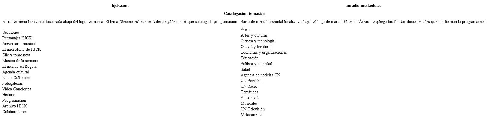 Para los portales web periodísticos relacionados con la radiodifusión sonora se destaca que la barra del menú principal se rotula por bloques que en general, contiene secciones periodísticas como temas "Nacional", "Política", "Deportes", "Economía", y recursos tecnológicos del tipo podcasts y videos. Las emisoras de interés público (cultural y universitaria) catalogan los temas de programación a través de una barra de navegación con menú horizontal desplegable, localizado en la parte inferior del logo de marca. Estos menús son los más simples pero de mayor precisión temática pues las palabras clave no dan lugar a la divagación a pesar del orden ambiguo por ejemplo, "Secciones", "Programación", "Temáticos", "Musicales".