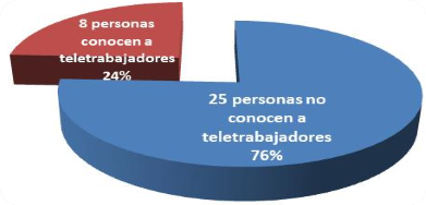 De las 33 personas que respondieron a la publicación, 25 (76%) de ellas mencionaron que no conocían a otras personas que desarrollaran el teletrabajo como modalidad de empleo, pero por otro lado los participantes restantes (ocho) (24%) manifestaron sí conocer a alguien que realizara este tipo de empleo en la ciudad de Durango, lo cual nos da como resultado un factor del 10% de personas que conocen a algún teletrabajador.