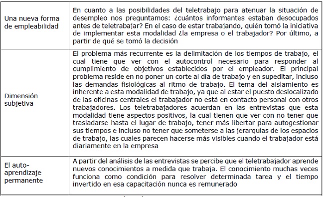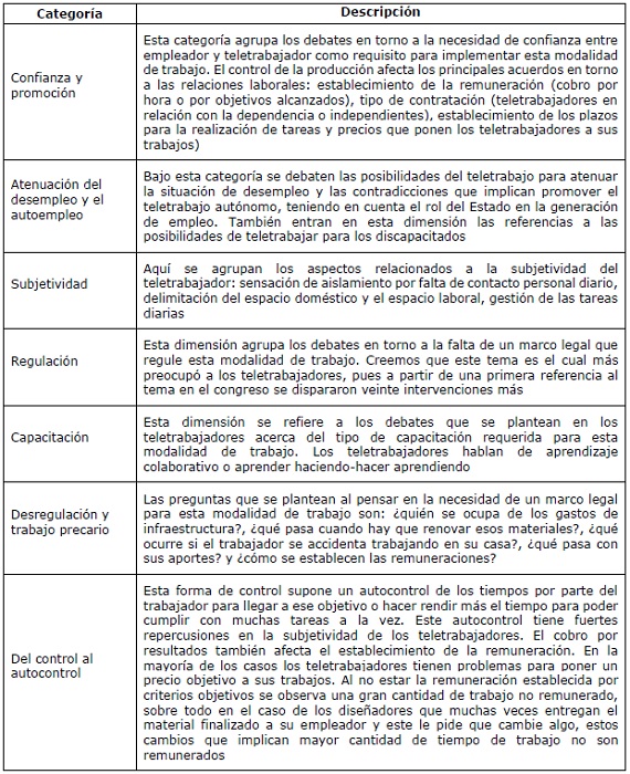 En un trabajo desarrollado en Argentina por Miano (2004), se plantea que el teletrabajo tiene una serie de categorías, deducidas por la autora, donde la temática del estudio referido se puede llevar a cabo. Además de agrupar las áreas de impacto del tema, estas categorías se mencionan y describen en la tabla 1.