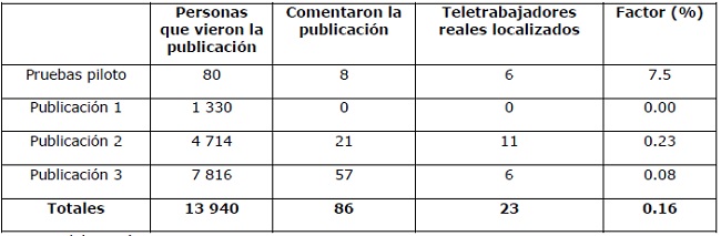 Se invitó en una primera ronda por medio de un mensaje de texto (inbox) a diez personas previamente ubicadas en el listado de amigos en la página personal del investigador, se les instruyó para que visitaran la página (instrumento creado), leer la descripción, ver el contenido publicado en ella y retroalimentar con algún comentario para saber si les resultó clara la información; incluso, si pudieran referenciar a algún conocido que labore bajo el esquema del teletrabajador.