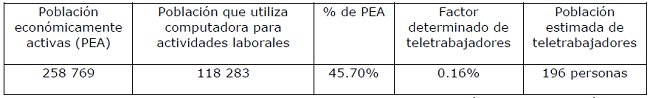 Con la aproximación anterior se cumple con el objetivo del presente trabajo, ya que inferir un número aproximado de teletrabajadores es necesario para la continuación con otros estudios relacionados con este tema.
