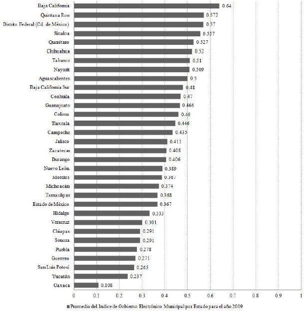 Como se aprecia en la gráfica 1, los gobiernos municipales de los estados de Baja California, Quintana Roo, Distrito Federal (Cd. de México) y Sinaloa obtuvieron los valores más elevados, con índices de 0.64, 0.572, 0.57 y 0.557 respectivamente; mientras que los ayuntamientos de las entidades federativas de Chiapas, Sonora, Puebla, Guerrero, San Luis Potosí, Yucatán y Oaxaca registraron cifras menores a 0.30, lo que deja entrever un estado raquítico y falaz del uso de las TIC en sus actividades gubernamentales.