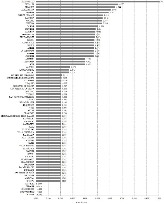 Como se puede apreciar, en 2009 el gobierno del municipio de Hermosillo era el mejor posicionado en términos del Índice de Gobierno Electrónico Municipal, al contar con un mayor número de equipo de cómputo, cantidad de líneas telefónicas, conexión a internet y un portal web que proporcionaba servicios informativos, interactivos y transaccionales (gráfica 1); de manera subsecuente, los gobiernos municipales de Nogales, Guaymas y Agua Prieta obtuvieron valores de 0.670, 0.644 y 0.608, respectivamente.