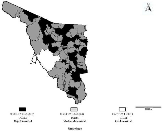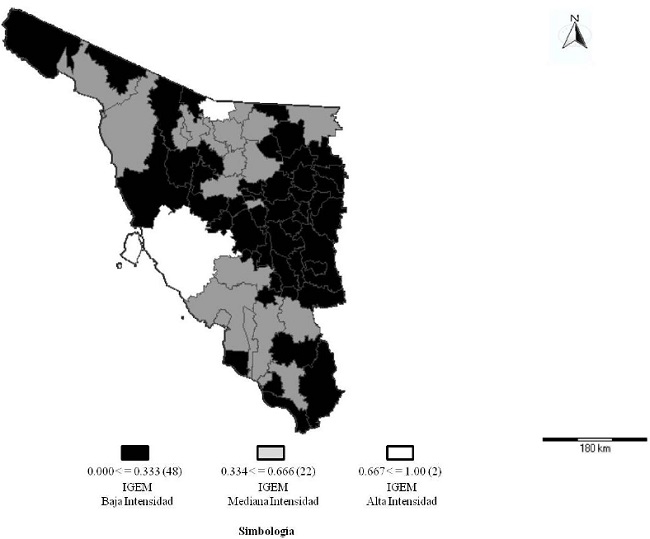 Los índices obtenidos se estratificaron en tres grandes grupos: IGEM de baja intensidad,11 IGEM de mediana intensidad12 e IGEM de alta intensidad,13 y se referenciaron geoespacialmente a través del programa IRIS-SCINCE, tomando como base el marco geoestadístico del estado de Sonora y el marco geoestadístico municipal 2005. Se generó un mapa de la entidad por división municipal, donde se puede apreciar la estratificación del Índice de Gobierno Electrónico Municipal.