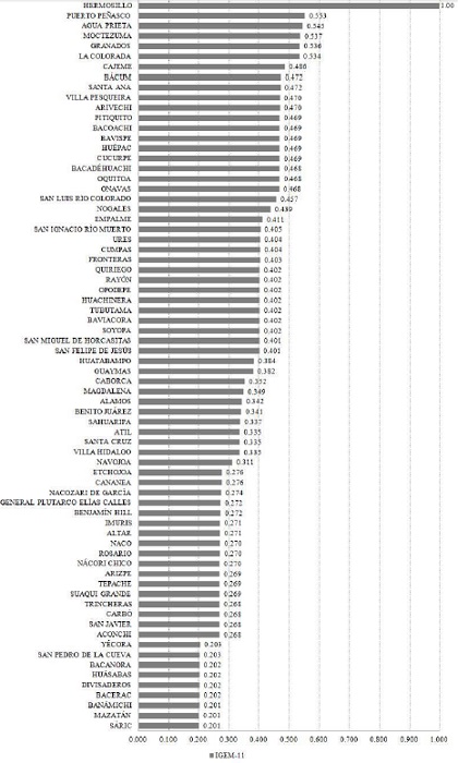 En el extremo contrario se ubicaron los ayuntamientos de Arivechi, Tepache, Divisaderos, Nacori Chico y Soyopa, cuyos valores ascendieron a cifras menores a 0.007 del índice, lo que implica una infraestructura tecnológica raquítica, ya que registran cantidades mínimas de equipos computacionales, líneas telefónicas, carecían de conexión a internet y no disponían de página web (gráfica 1; mapa 1).