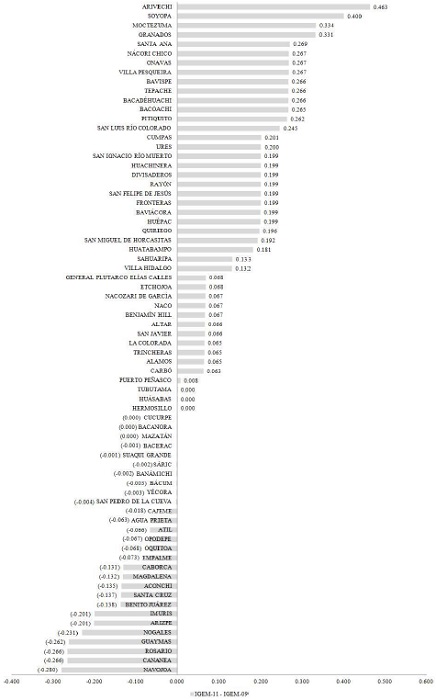 De los 72 gobiernos municipales, 38.89% tuvieron un retroceso en su índice de gobierno electrónico, solo en los casos de Hermosillo, Huásabas y Tubutama se registraron variaciones insignificantes; en 41 ayuntamientos se tuvieron incrementos, de los cuales en el 92.68% de los casos fueron de baja intensidad (0.00-0.33) y en 7.32%, de mediana intensidad (0.34-0.66).