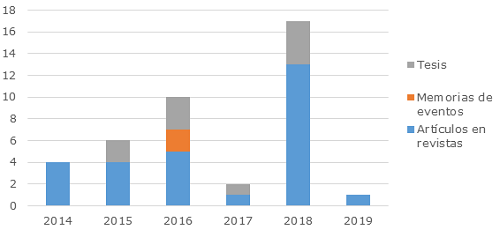 La gráfica 1 muestra el resultado de la búsqueda de literatura realizada en este artículo, de 2014 a abril de 2019. Los años 2017 y 2018 se destacan como los de menor y mayor cantidad de trabajos publicados, respectivamente; las investigaciones publicadas en 2018 representan el 43.5% del total de los trabajos identificados. Las revistas científicas se identificaron como los medios de publicación más utilizados (70%), seguidas de las tesis (25%).