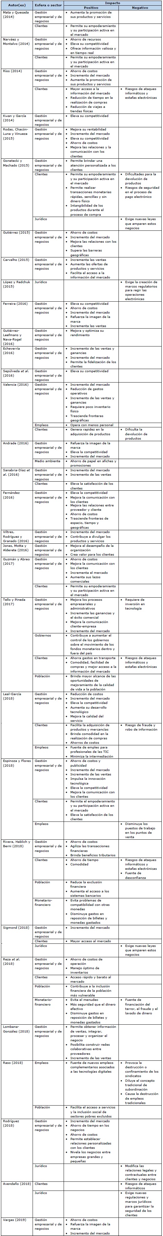 La tabla 1 recoge los diferentes aspectos abordados en la literatura que reflejan el impacto de los negocios electrónicos en las sociedades latinoamericanas. Estos impactos pueden clasificarse como positivos o negativos, y se relacionan con la esfera o sector de la sociedad donde inciden según el criterio de los diferentes autores consultados.