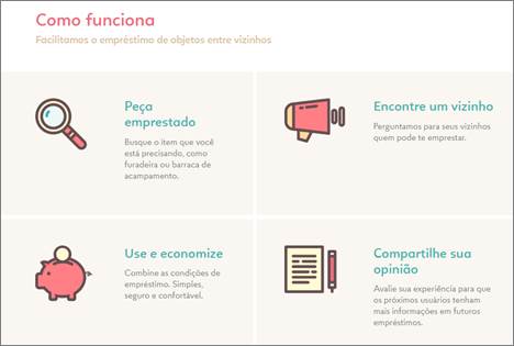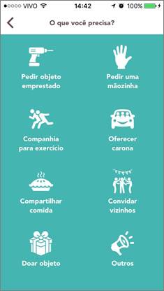 As possibilidades de interação são variadas. É possível encontrar pedidos de empréstimo de objetos, como por exemplo mochilão para viagem, barraca de camping, projetor de vídeo para casamento, furadeira, livros para estudos ou então pedidos de ajuda para montagem de armário, companhia para atividades físicas como corrida, até doações de livros ou comidas, por exemplo papinhas de crianças (figura 4).