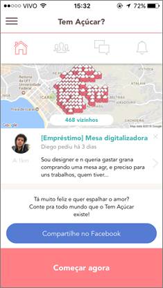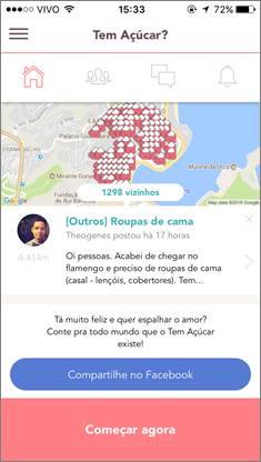 É nesse contexto que se escolheu abordar o aplicativo de celular Tem Açúcar?, que se posiciona em nome do consumo consciente, da reconstituição dos laços comunitários e da preservação do meio-ambiente. Trata-se da plataforma de compartilhamento de bens mais difundida no Brasil, tendo alcançado mais de 180 mil usuários (Redbull, 2019). O aplicativo não tem fins lucrativos, opera atualmente em aproximadamente 10 mil municípios brasileiros e registra atividades em todos os estados do Brasil, seja em metrópoles como São Paulo e Rio de Janeiro, seja em cidades com menor densidade demográfica (Autossustentável, 2017).