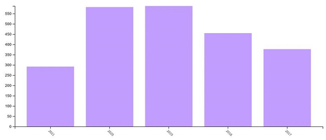 Conocer los actores más influyentes en las redes sociales ha sido de interés para la comunidad científica, como afirman Kim y Hastak (2018) y Sadri et al. (2021). Es por esto que los estudios relacionados con esta área del conocimiento han tenido un elevado crecimiento desde 2010 hasta la fecha. Un análisis bibliométrico en la Web of Science (WoS) con los términos “social network analysis” e “influence analysis and social media” mostró su utilización y evolución. En la figura 1 se muestran estos datos, los cuales se encuentran agrupados por el año de publicación. En el análisis documental, para los términos clave analizados, se constató un total de 2 293 resultados en el período de 2017 a 2021.
