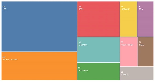 Del mismo modo, del total de 2293 resultados de investigación, 21.63% es creado por Estados Unidos, que es el país que más resultados presenta en el análisis de las redes sociales y la influencia en estas. A nivel global, China es el segundo país con 12.29% (ver figura 3). Además, de toda la producción científica creada en el período de 2017-2021, 94.65% corresponde a artículos de investigación, 4% a artículos de revisión y 1.5% a resultados de innovación patentados.