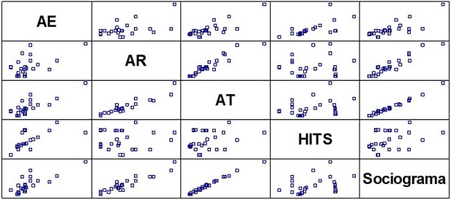 Por último, en la figura 5 se muestran los análisis realizados por medio de diagramas de dispersión. De esta manera se aprecia de forma clara la relación lineal existente entre la AT y el sociograma, pues los puntos que grafican la correlación entre estas dos variables se agrupan y forman una recta. Asimismo, los puntos que grafican la correlación entre la AT y el HITS y entre el HITS y el sociograma aparecen dispersos, lo cual reafirma la existencia de una baja correlación y relación casi nula entre el conjunto de datos analizados. Lo anterior indica la pertinencia y validez del algoritmo desarrollado para medir la autoridad e influencia de los usuarios en este entorno.