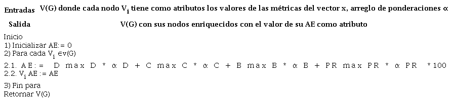 Para el cálculo de la AE se considera la centralidad de grado (D), porque representa la popularidad (cantidad de contactos) del usuario, y la centralidad de cercanía (C), pues permite identificar lo rápido que se puede relacionar este usuario con los demás. Asimismo, se considera la centralidad de intermediación (B), porque permite detectar aquellos usuarios que conectan las distintas comunidades que se forman en la red, y el PageRank (PR) ya que posibilita la identificación de la importancia del usuario a partir de la relevancia de sus contactos. Los valores de estas métricas se encuentran unificados al utilizar la técnica normalización por el mayor elemento y luego son combinados mediante el operador de agregación media ponderada. Luego de aplicar el operador de agregación, el resultado es multiplicado por 100 para que los valores de la AE se encuentren en el intervalo . La fórmula general para calcular la AE es la siguiente (ver fórmula 8).